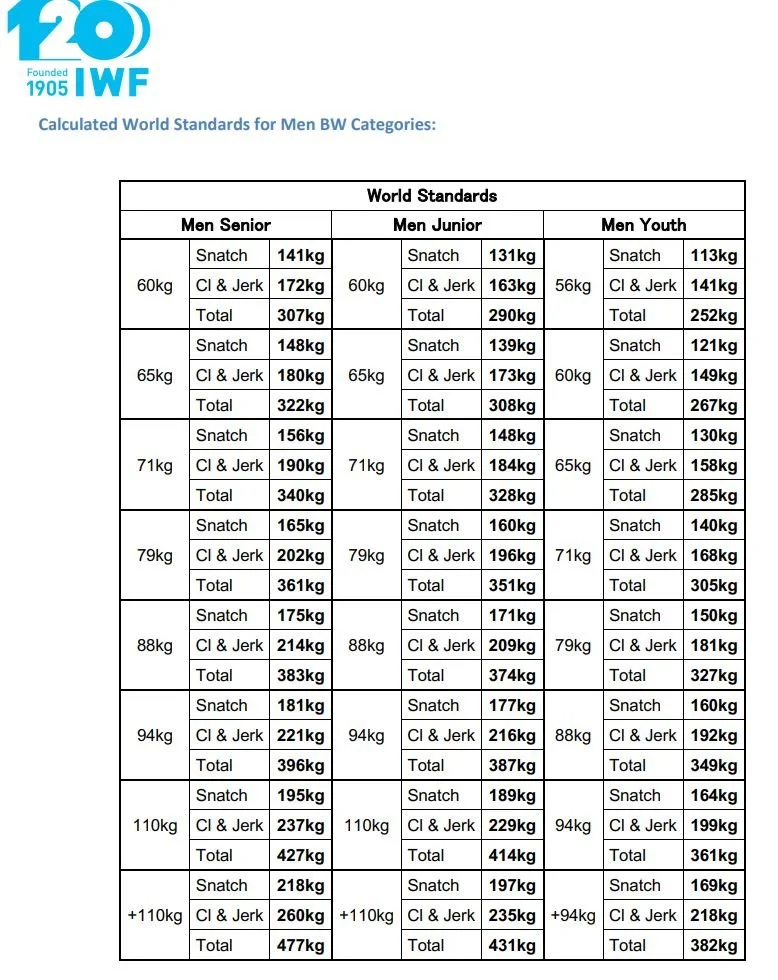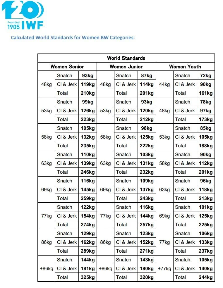 もうすぐ日本でも新階級が導入されますね!IWF(国際ウエイトリフティング連盟)開催の大会ですと6月から新階級が導入されています。IWF公式サイトを見るともう世界選手権に向けて全階級のスタンダード記録がのっています。